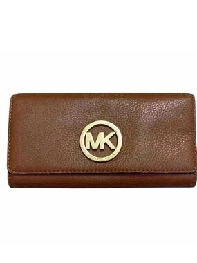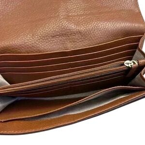 Michael kors fulton carryall wallet. Button closure. This has scratches on the outside. On the inside flap there’s pen and scratches.