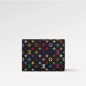 Chic Louis Vuitton x Takashi Mutakami Victorine collage wallet with vibrant monogram design. Features a black base with colorful accents. Ideal for a stylish touch.