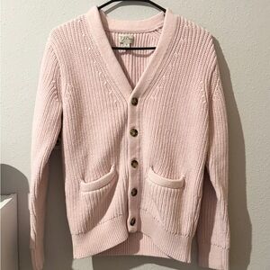 Chic light pink cardigan with button-up front. Features two front pockets. Ideal for layering.