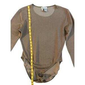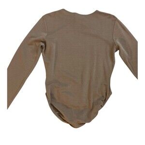 Pre-owned 90s Ann Taylor womens bodysuit in good condition. Light brown/tan ribbed stretch fabric. Scoop neck, long sleeves, snap closure at the bottom. No holes or stains noted.