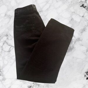 Stylish black leather patch with embossed Dussault black cotton jeans.