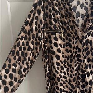 Elegant blouse with bold animal print. Features faux zippered pockets. Ideal for stylish outings.