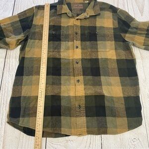 Classic plaid design. Olive and mustard tones. Perfect for casual wear.