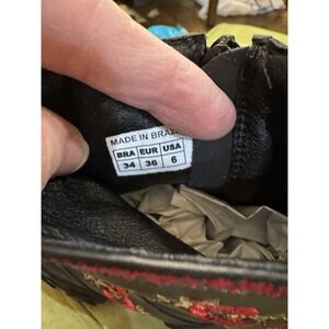 The Farm Rio Black Boho Mid Boot in Women's Size 6 is a stylish and unique pair of boots featuring embroidered rose stitching on black leather. The floral pattern and bohemian theme give off a trendy and carefree vibe, perfect for those who appreciate a blend of vintage and modern aesthetic. The zip closure adds convenience and ease of wear, making these boots a versatile option for everyday or special occasions. These boots are sure to make a statement and elevate any outfit with their intricate detailing and bold design choices. 22212. 111025