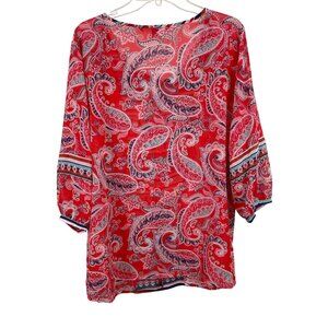 Valerie Stevens Womens Size 2X Top Red Paisley Sheer Boho Tassels Blouse Shirt