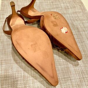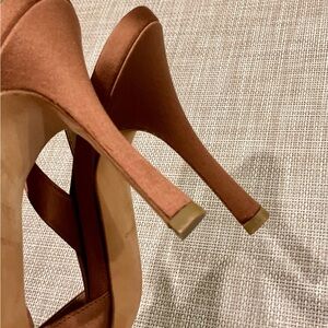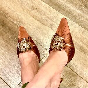 Chic brown satin heels by Rene Caovilla. Features intricate embellishments. Ideal for elegant events.this shoes are in perfect condition , I wore them ones indoors , regular price 799$. The stones are perfect no one stone is missing no scratches scuffs or nothing. Size is US 8.5 .no box