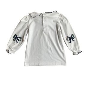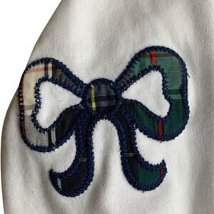 White soft and thick long sleeve shirt with plaid elbow patches in the shape of bows