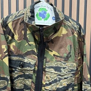 Stylish camouflage jacket with a military design. Features a zip-up front and multiple pockets.