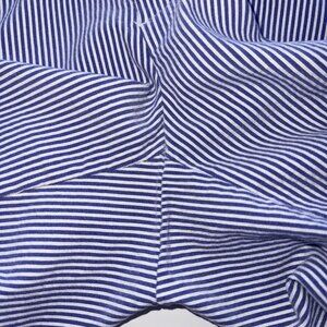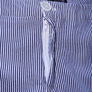 Lightweight stretch seersucker fabric with blue and white stripes. Features a button-zip waist closure, slim-fit silhouette, and back welt pockets. Perfect for casual or summer occasions.