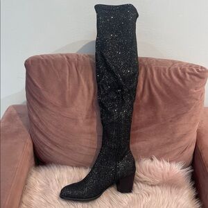 Step out in style with these elegant black glitter knee-high boots. Perfect for adding a touch of sparkle to any outfit.