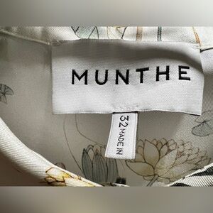 Elevated designer silk blouse by MUNTHE, a Copenhagen-based brand known for artistic prints and luxury fabrics. This 100% silk button-down features a stunning botanical lotus and crane motif on a soft ivory background. Lightweight, breathable, and effortlessly chic—perfect for work, travel, or elevated casual styling.