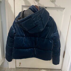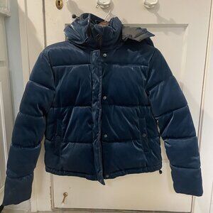 Enjoy this short shiny navy blue puffer jacket by Forever 21. It features a detachable hood.