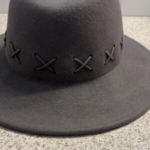 Elegant charcoal fedora featuring unique X stitch design. Ideal for versatile styling. Slight loose stitch under the brim as pictured.