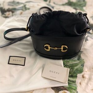 GUCCI Azalea Sakai Calfskin Horsebit 1955 Drawstring Bucket Bag Black