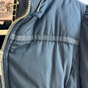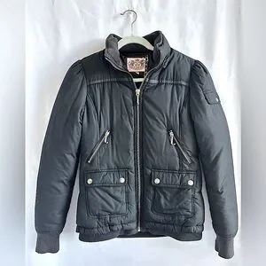 This women's jacket is a stylish and practical choice for cold weather, featuring a quilted design with sections that are "puffy" due to down or synthetic insulation. The jacket is black with gold-tone hardware accents, including zippers on the main closure and pockets, and snap buttons on the lower pockets. It has a high neck, long sleeves with ribbed cuffs and hem for a snug fit, and a full zip closure. Juicy Couture, Puffer Jacket, Black, Quilted, Down, Feather, Insulated, Winter Coat, Outerwear, Women's, Ladies, Full Zip, High Neck, Gold Hardware, Ribbed Cuffs, Warm, Stylish, Designer, Y2K, Glam, Casual, Cozy, Pockets, fur hood, 2000’s, fur, street wear,