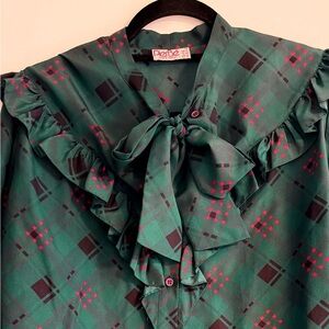 Vintage made in France Pierbé 70s Button Down Blouse size 12. Doesn’t have a fabric tag but feels like polyester. Has a tie that you can let hang or tie in a bow. Good used vintage condition no rips or stains
