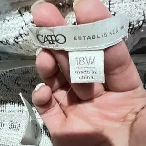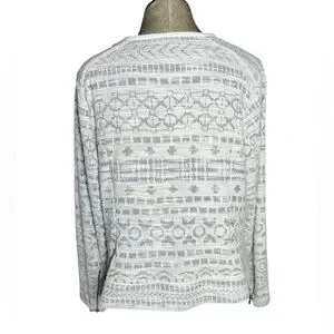 Elegant knit jacket with cream and gray pattern. Features a chic design.