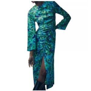 Zara blue and green floral midi dress. Size L. Excellent condition. Can adjust ruched portion