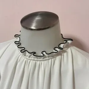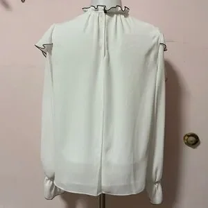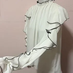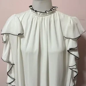 This elegant white blouse features stylish ruffle details with black trim, its sophisticated design adds a touch of class to your wardrobe.