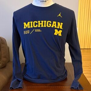 Navy long sleeve tee with bold yellow Michigan graphics. Features Jordan logo. Comfortable and stylish.