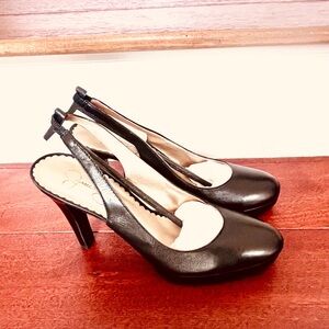 Chic black platform heels with slingback design. Ideal for elevating any outfit.