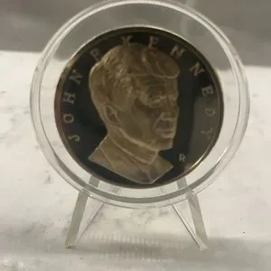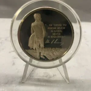 This commemorative coin features JFK on the front and “of those to whom much is given, much is required” on the back. The coin measures 2.5 inches and the clear case overall measures 3.5 inches. It comes with a small plastic stand. This came from my uncle’s estate and I think he most likely bought it at the JFK Presidential Library because I know he once visited there.
