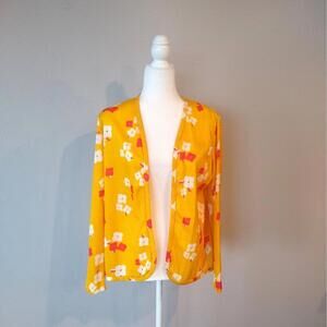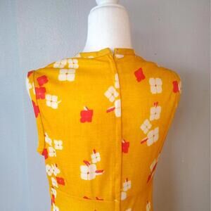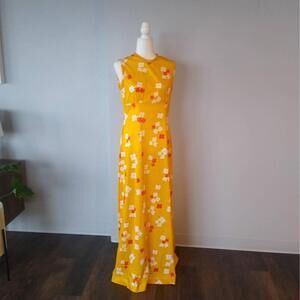 1960s or 1970s vintage Made for Davids Fort Lauderdale ankle length dress with matching jacket. Dress is sleeveless with high round/scoop neck. Hidden zipper at back. Darts at bust. Empire waist with long skirt that flares at bottom. Jacket has long sleeves. No closure - intended to be worn open. Both are made from a thinner polyester fabric in a marigold yellow color with red and white flowers allover. Fabric does have stretch.