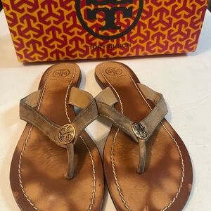 Tory Burch Tan Cameron Metal Granite Suede Sandals Size 8M. In pre-loved condition normal wear to the suede and wear to the bottom soles. PLEASE VIEW ALL PHOTOS AS THESE SHOW ADEQUATE WEAR. Selling as-is. Comes from a non-smoking home.