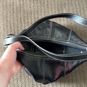 This is a black faux leather shoulder bag featuring silver-toned hardware and a front flap pocket with a turn-lock closure. The bag has a single adjustable strap and visible contrast stitching, giving it a modern yet versatile look. The overall condition is good, with minor signs of wear but no major damage