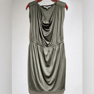 Sleeveless satin Rachel Roy Dress in a beautiful olive/loden color. Missing original belt but can be worn without or accessorized with one of your choosing. Can be dressed up or down. Formal event with heels or brunch with scrappy sandals. Versitale and elegant.