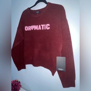 Stay cozy and stylish with this burgundy sweater featuring a playful 'Dramatic' design. Perfect for any casual outing.