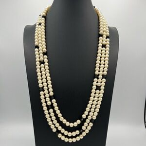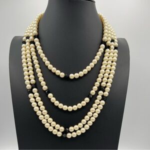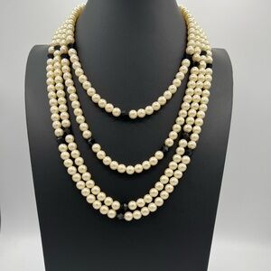 Vintage Extra Long 89" Heavy Glass Faux Pearl & Black Bead Necklace