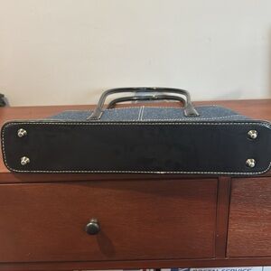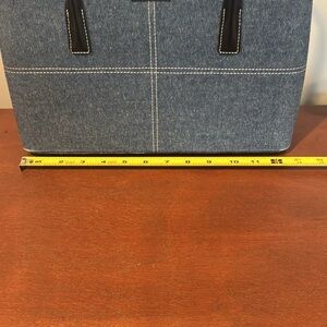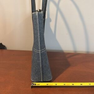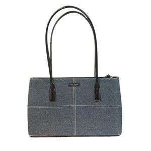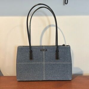 Gently preowned still in very nice shape. It is a denim with white stitching black handles. This is an old school Kate Spade with the ribbon logo on the front rather than the newer stamped logo.