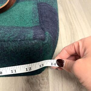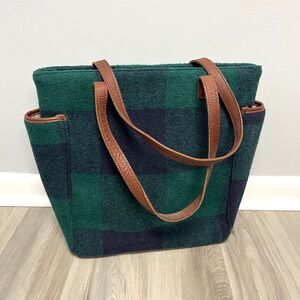 Excellent used Condition Women’s Duluth Trading Co Navy Blue and Green Wool Blend Plaid with Brown Trim Purse Tote Bag