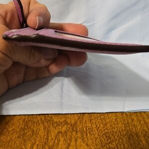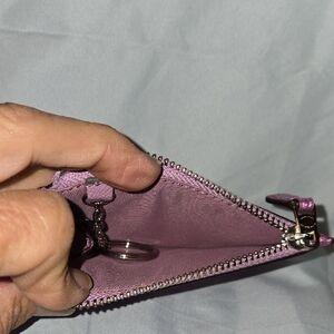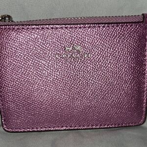 Chic metallic purple card wallet by Coach. Sleek and functional. Fits great into jean pockets or the breastfeeding pocket of a coat. Theres even a key for for compact traveling.