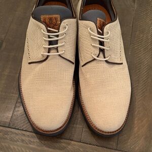Introducing the Men's Countryaire Suede Plain Toe Oxford by Martin Dingman in a timeless bone shade. These shoes boast water-repellent suede and are designed with an almond toe shape, perfect for all-season wear. Featuring elastic non-tie laces, a lightweight rubber sole, and neoprene performance lining, these Oxfords offer a heel-to-toe comfort system. Ideal for fall occasions like Thanksgiving and graduations, this handcrafted style embodies the essence of quiet luxury.