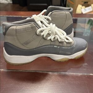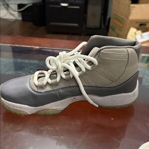 Sleek Jordan high-tops in gray and white. Iconic design with comfortable fit. - I changed the laces because they were frayed