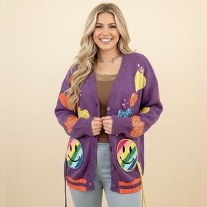 A cheerful smiley face cardigan that effortlessly infuses playfulness into your wardrobe. Crafted with a cozy knit, this cardigan features vibrant smiley face patterns, adding a touch of whimsy to your look. Perfect for bringing a positive vibe to your style while keeping you warm and stylish.