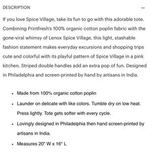 2025 LENOX PRINTFRESH Spice Village Tote Shopping Bag Organic Cotton