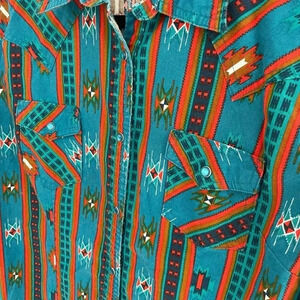 color: blue with all over aztec print in orange, brown, white