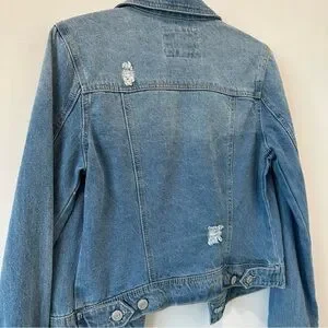 Details: An essential denim jacket goes for a remix with a fitted silhouette and slightly cropped hem, long sleeve jean jacket, button up closure, side pockets, distressing throughout, light wash, light blue jeans