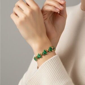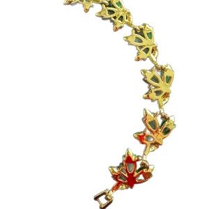 Vintage Marvella statement bracelet featuring a gold-tone link chain adorned with beautifully carved green leaf-shaped elements. Elegant and eye-catching, this piece adds a timeless, nature-inspired touch to any outfit. Perfect for vintage lovers or anyone looking to elevate a simple look with classic costume jewelry charm.