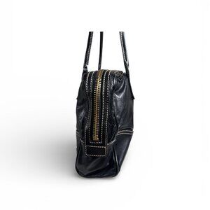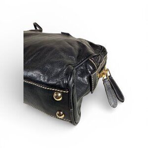 Authentic Gucci Joy Boston Bag in black soft leather with contrast stitching and gold hardware. A chic, structured satchel silhouette that is equally functional for everyday or work.Pre-owned, good condition. Exterior leather is soft with natural creasing consistent with use. Corners show light wear and rubbing (see photos). Hardware has mild signs of use. The interior is clean. Zippers work smoothly.