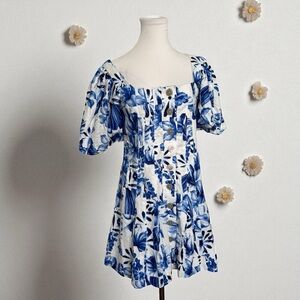 Romantic and chic, this House of Harlow 1960 mini dress features a bold cobalt blue floral print on a crisp white background. Designed with a flattering square neckline, puff sleeves, and button front details, this piece radiates effortless bohemian charm. Perfect for summer parties, brunch, or a vacation getaway, it’s lightweight and stylish with a flirty silhouette.