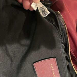 Elegant Marc Jacobs tote in rich burgundy. Features gold-tone hardware and front zipper pocket. Perfect for everyday use.