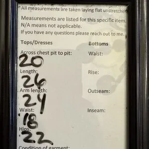 Approximate Measurements taken laying flat: Pit to pit 20”, length 26”, arm length 24", waist 18", hips 22"