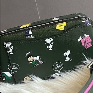 Stylish green crossbody bag. Features Snoopy and friends design. Includes a bold strap with purple accents. Iconic Marc Jacobs logo detail.