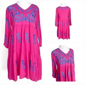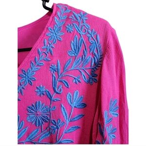 J. Marie Fuchsia Pink Blue Embroidered Floral Boho Dress Size Medium Flowy Tunic