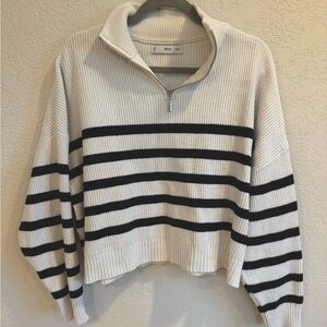 Stay stylish and cozy with the Mango Women's Striped Sweater. Featuring a chic navy and white design. The sweater still has a lot of life left in it but does have two snags on the back (please see the last picture).
