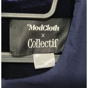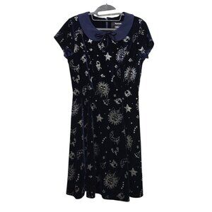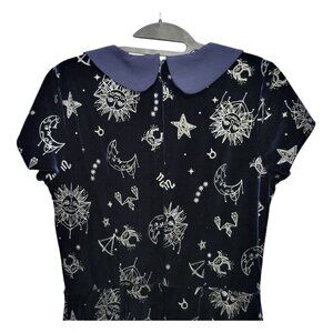 Playful yet polished ModCloth x Collectif velvet skater dress featuring an allover zodiac and celestial print. Soft navy velvet with suns, moons, stars, and astrological symbols, finished with a contrast collar and bow detail. Flattering fit-and-flare silhouette that feels elevated while still easy to wear.